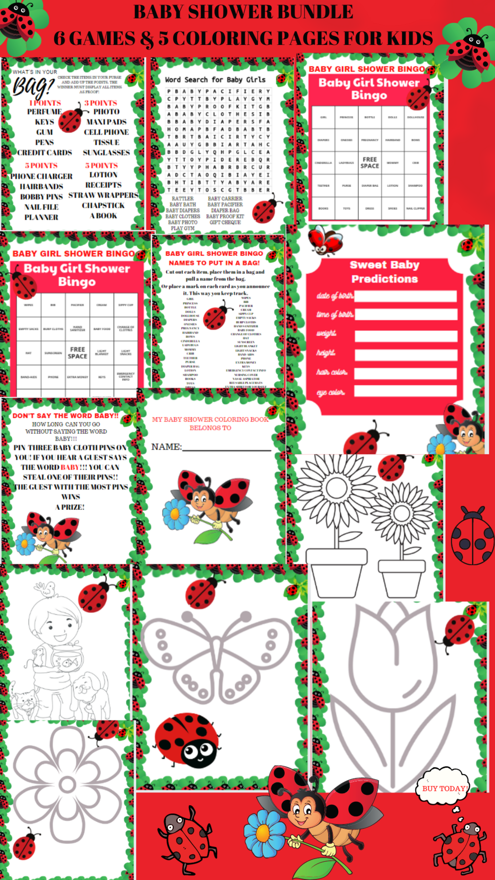 Red Ladybug Themed Baby Shower Bundle that includes 6 games and 5 Coloring pages for kids!! What better way to have an Awesome Baby Shower with the cute ladybugs! While the Adults be playing the Baby shower Games, the little kids can color the pages that match the theme of the shower!! Keep it as a keep saver for life to show their new baby brother/sister what they did while there were still cooking in the oven!! (Mommy Belly) What you will receive in the Red Ladybug Themed Baby Shower Bundle is: